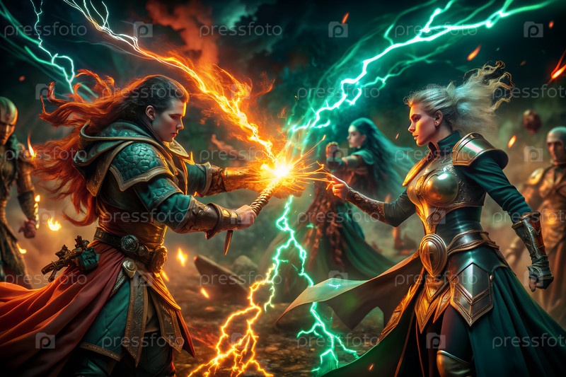 Эпическая фэнтезийная битва элементарных магов, бросающих огонь и молниеносную магию в вулканическом пустынном ландшафте