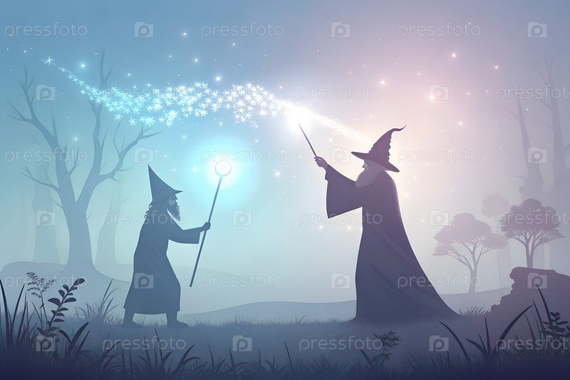Фантастические волшебники сражаются со светящимися магическими заклинаниями на пейзаже туманных холмов, силуэтами в мистической атмосфере