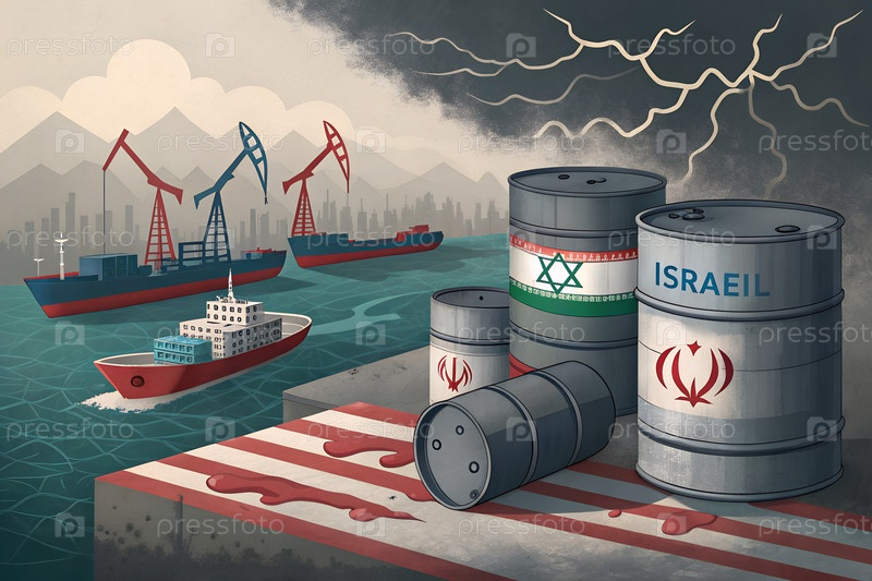 Редакционная иллюстрация энергетического конфликта США, баррелей нефти и горящего НПЗ, символизирующих геополитическую напряженность и войну