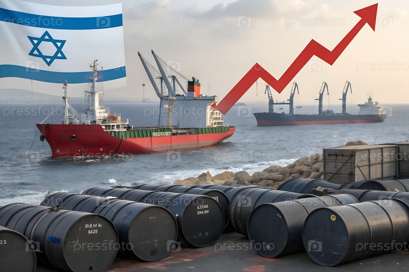Редакционная иллюстрация энергетического конфликта США, баррелей нефти и горящего НПЗ, символизирующих геополитическую напряженность и войну
