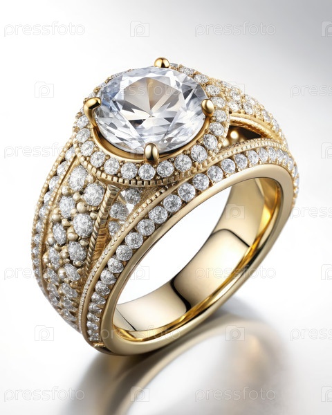 Близкий фронтальный вид золотого кольца с большим центральным камнем и несколькими рядами меньших камней
