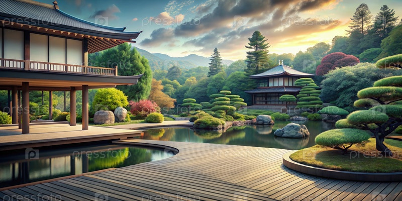 Спокойный японский сад с деревянной палубой и прудом на закате