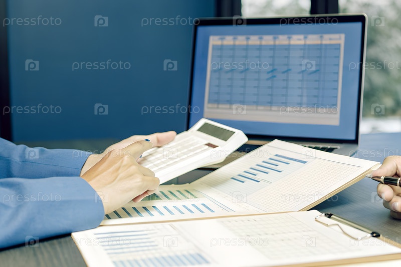 Бизнес-профессионал, анализирующий финансовые отчеты с помощью калькулятора и графиков на офисном столе