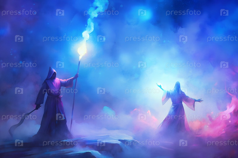 Фантастические волшебники сражаются со светящимися магическими заклинаниями на пейзаже туманных холмов, силуэтами в мистической атмосфере