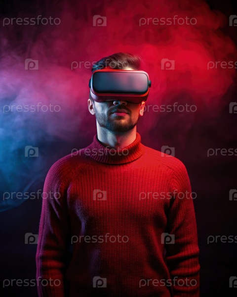 Ношение VR-гарнитуры . Мужчина в красном мужском свитере на задымленном фоне