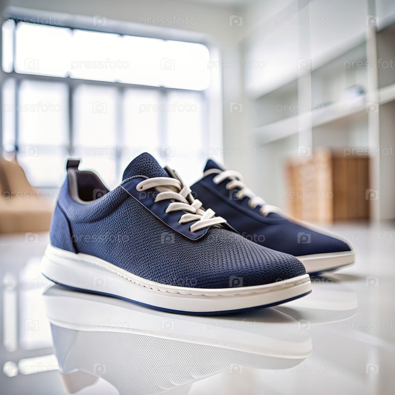 Ближайшее изображение голубых текстильных кроссов на белом столе в выставочном зале