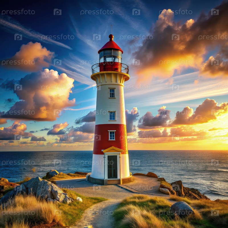 Величественный красно-белый маяк, стоящий высоко на прибрежной скале во время захода солнца