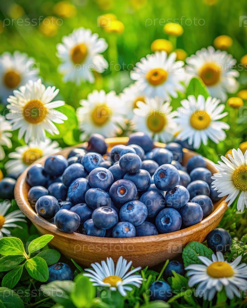 Свежие ягоды черники в деревянной миске, окруженные ромашками