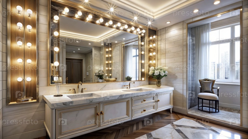 Роскошная ванная комната Hollywood Regency с тщеславием и большим зеркалом