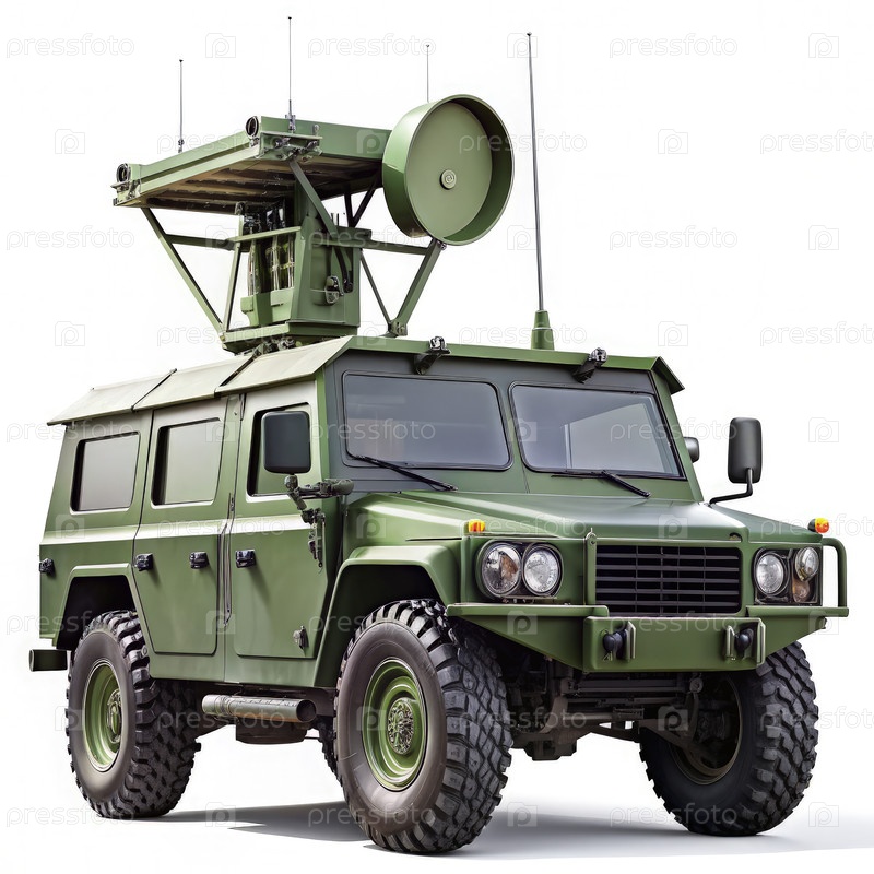 Зеленый военный автомобиль с большой антенной на вершине. генеративная ИИ