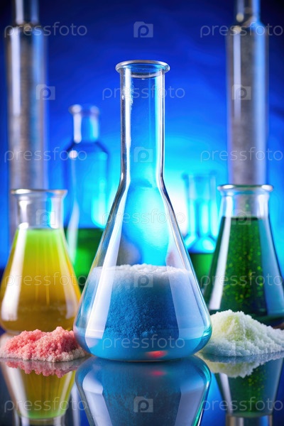 Флаконы, наполненные красочными жидкостями и твердыми веществами в лабораторных условиях