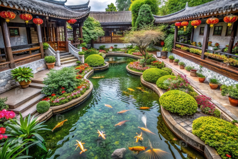 Спокойный китайский двор с прудом кои и пышными клумбами. генеративная ИИ