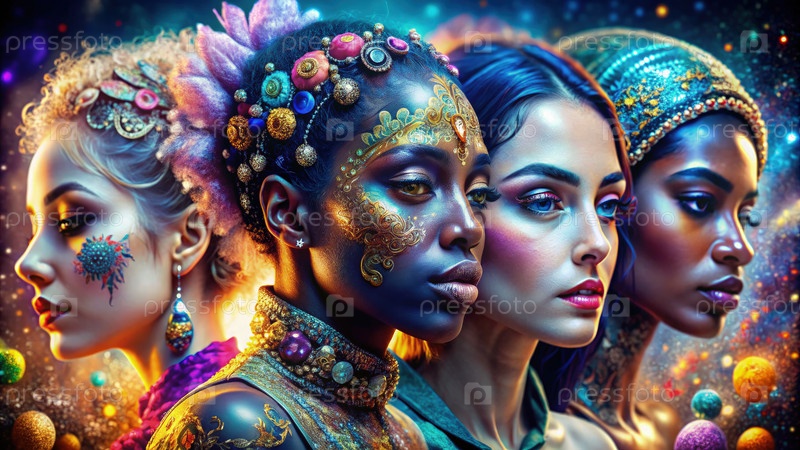 Четыре женщины с красочным макияжем и ювелирными украшениями позируют на космическом фоне
