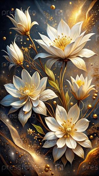 Золотой свет освещает белые цветы в яркой живописи