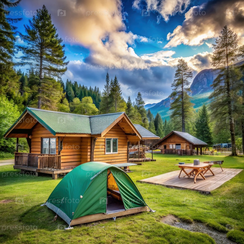 Кабинный кемпинг с зеленой горной палаткой и деревянной палубой