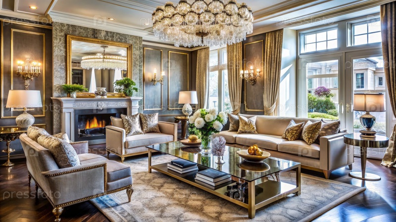 Гламурное оформление гостиной с украшенными люстрами. генеративный AI