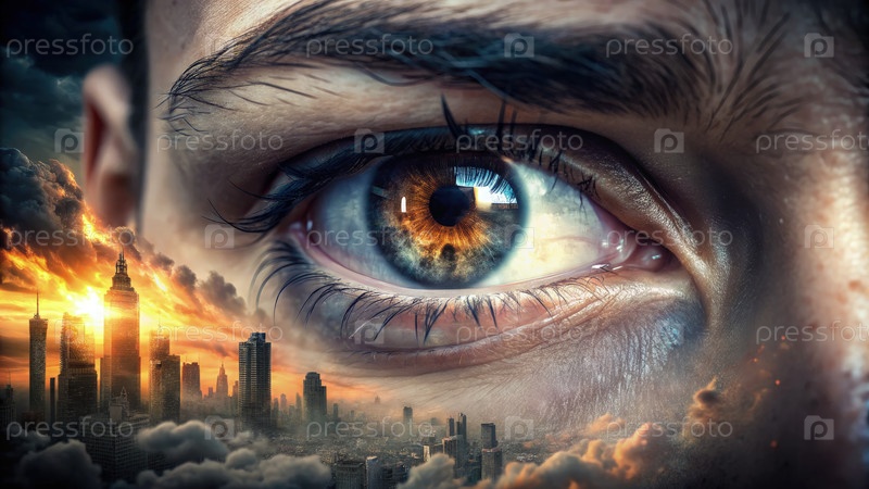 Ближайшее изображение человеческого глаза, отражающего городской пейзаж на закате