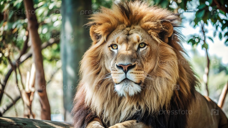 Величественный лев отдыхает в пышной лесной среде