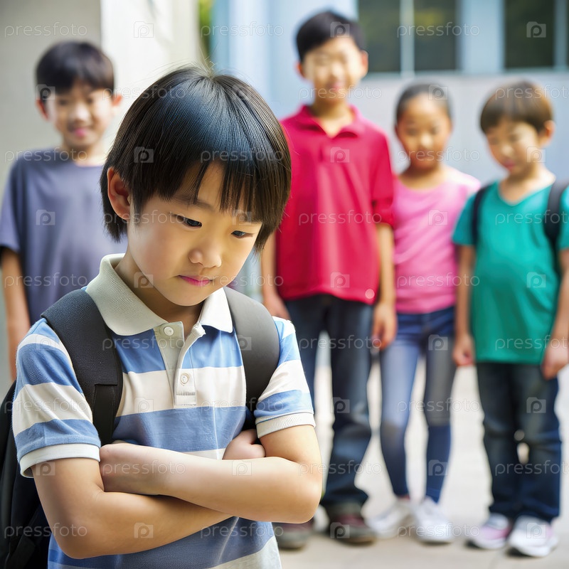 Молодой азиатский мальчик чувствует себя исключенным сверстниками в школе