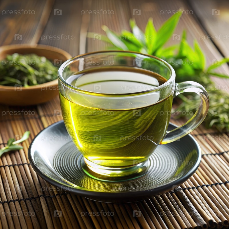 Стеклянный стакан зеленого чая на бамбуковом коврике. генеративная ИИ