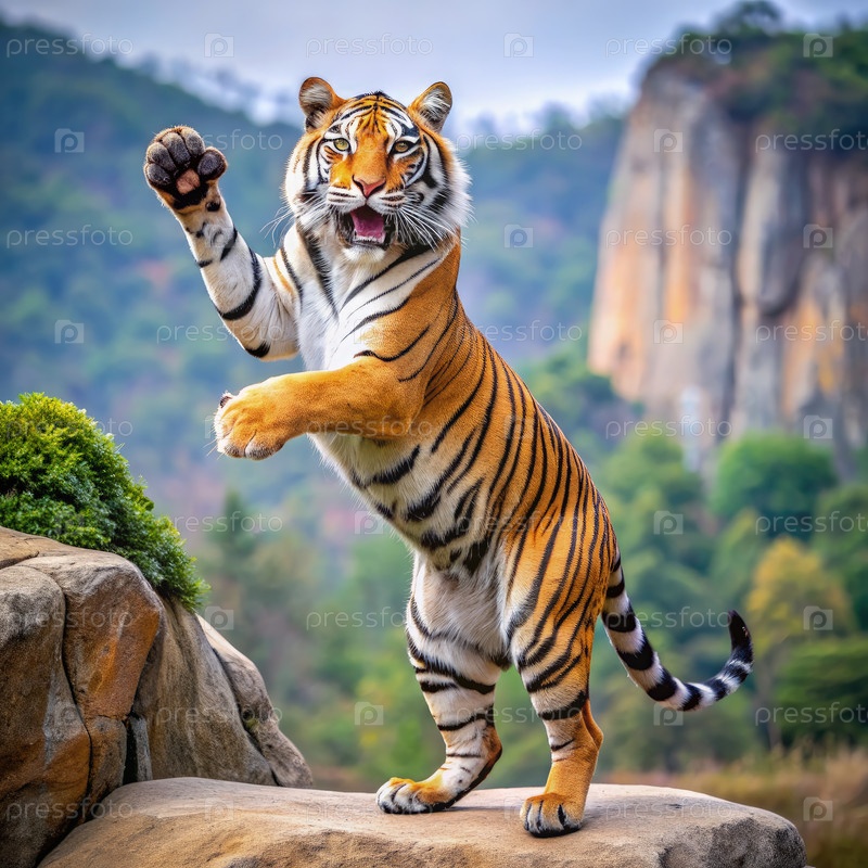Величественный горный тигр Бэкду, стоящий высоко на скале