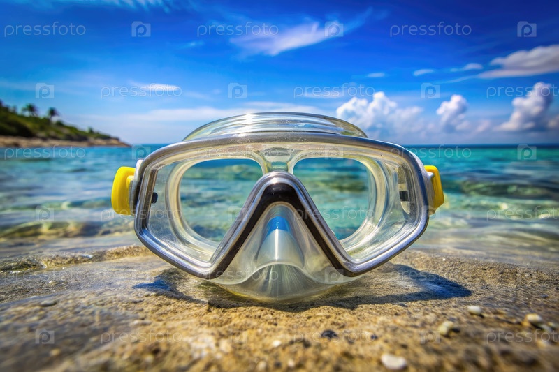 Сноркельная маска на песчаном пляже с ясным голубым океаном и небом