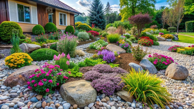 Красочный ландшафтный дизайн скального сада с пышной зеленой и яркими цветами. генеративная ИИ A