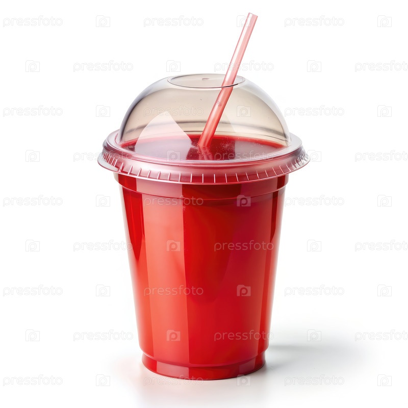 Красный пластиковый стакан с прозрачной крышкой и соломой, наполненной жидкостью