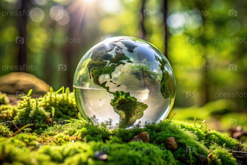 Кристальный шар, на зеленом мхе в солнечном лесу