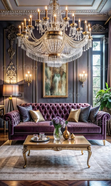 Элегантный дизайн интерьера гостиной с фиолетовым диваном и кристаллической люструшкой