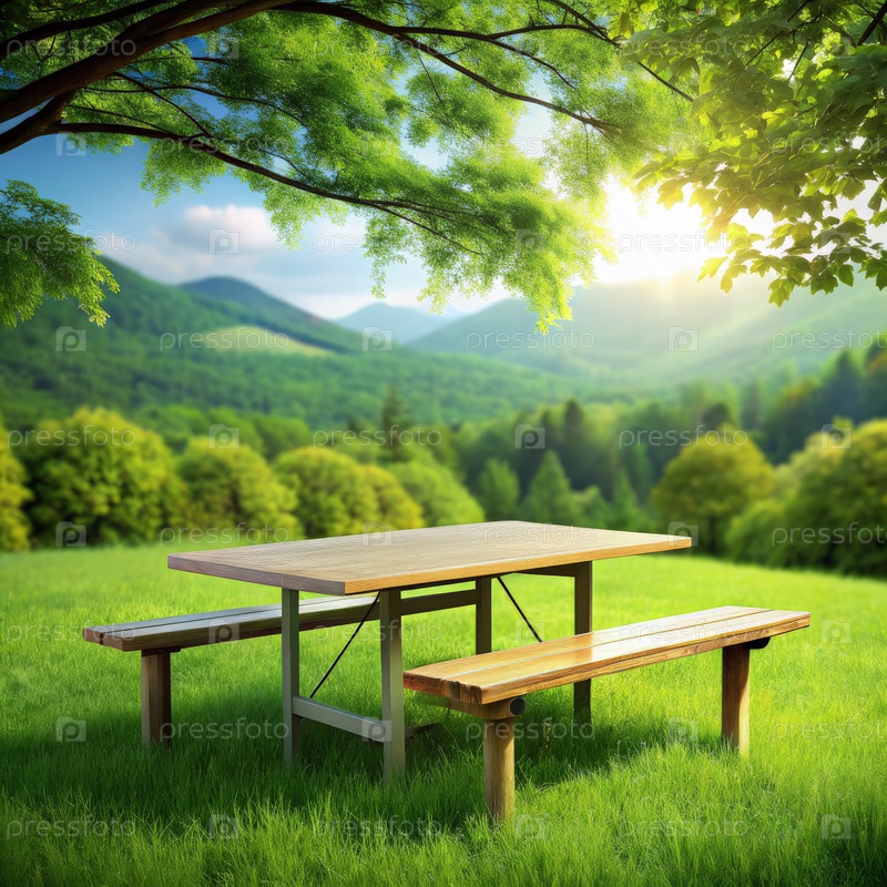 Деревянный пикник-стол на пышной зеленой луге с видом на горы