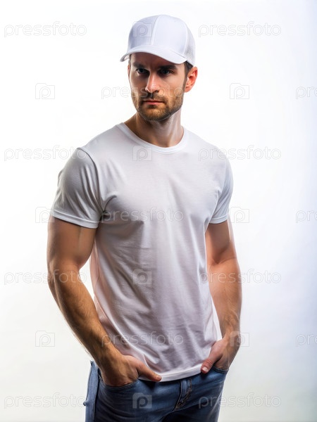 Мужчина в белой футболке и бейсболке позирует на белом фоне