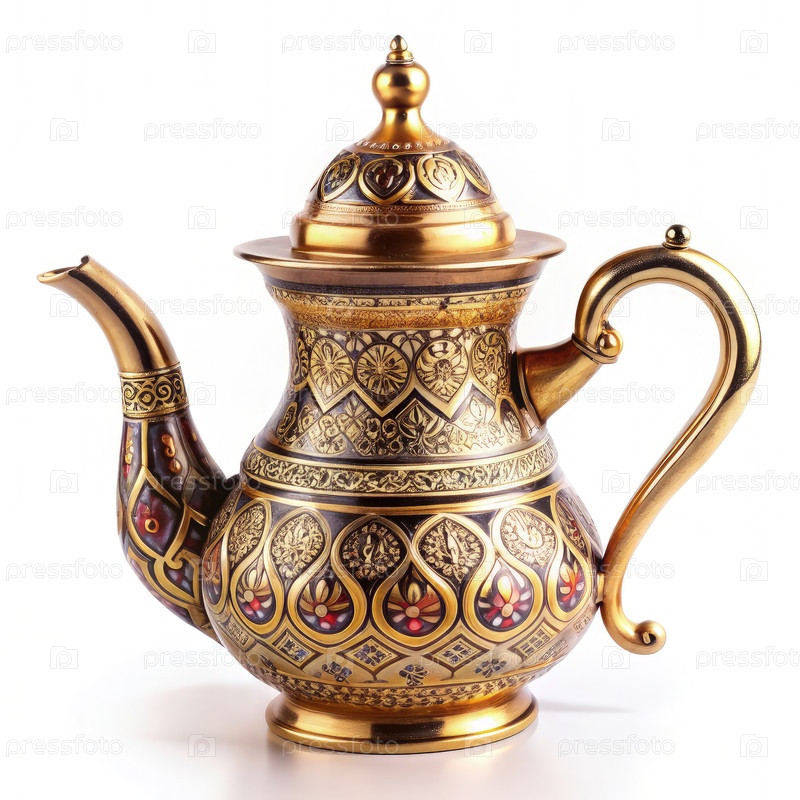 Украшенный арабский чайник со сложными золотыми и красными рисунками. генеративная ИИ