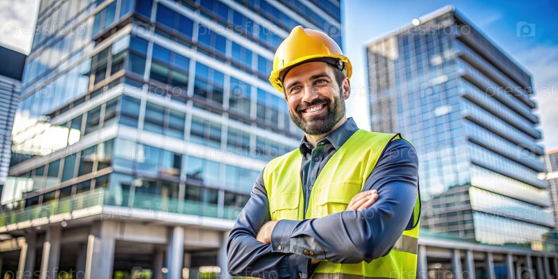 Улыбающийся строительный работник перед современным офисным зданием