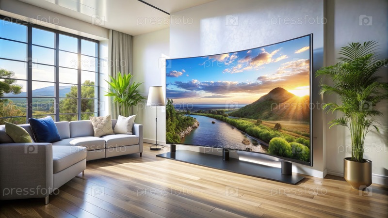 Телевизор с изогнутым экраном, демонстрирующий живописный вид на закат в современной гостиной