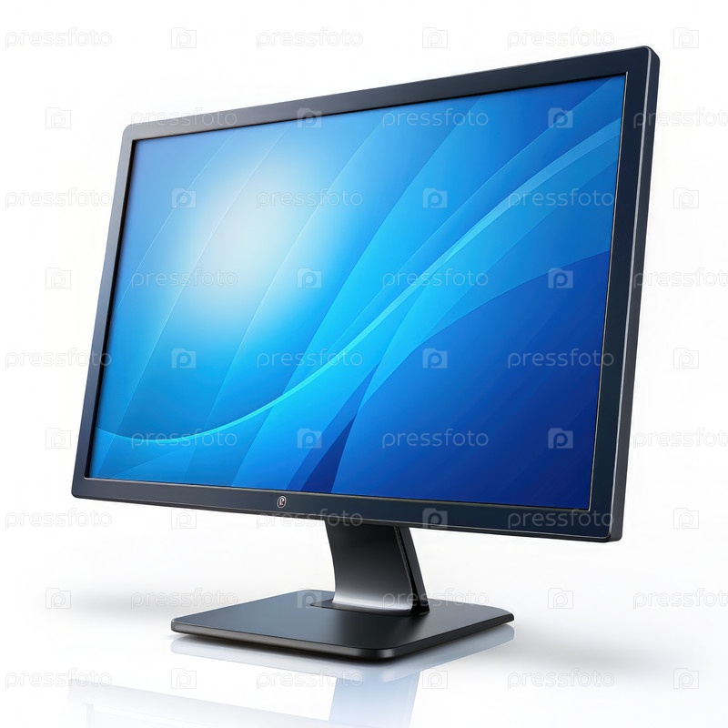 Черный компьютерный монитор с синей абстрактной обои отображается на белой поверхности