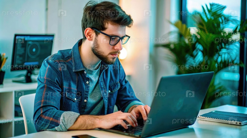 Молодой человек работает на ноутбуке в современной офисной обстановке