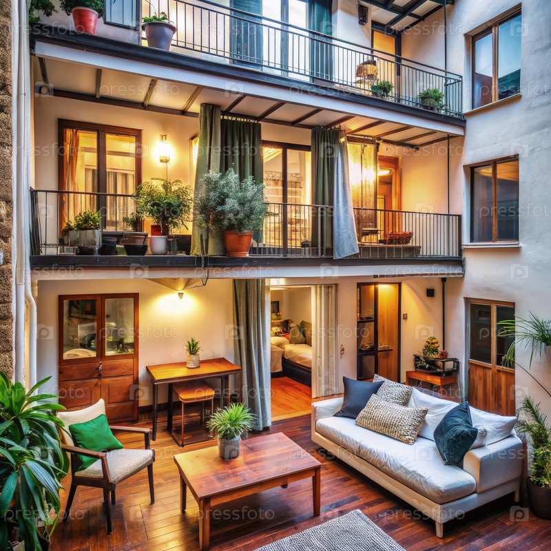 Апартаментный дворик с деревянной мебелью. генеративная современная ИИ