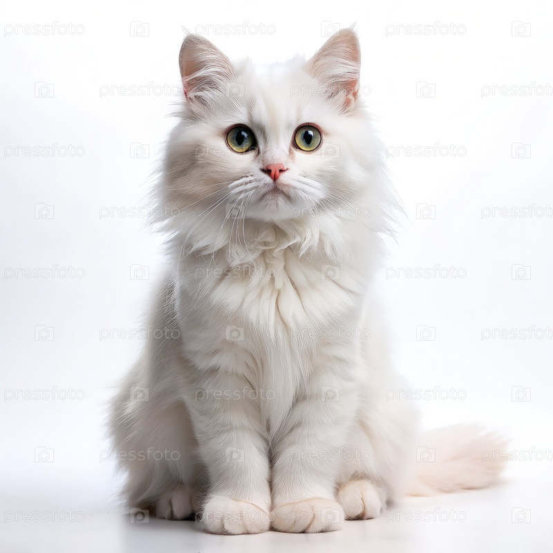 Белый пушистый кот, сидящий на белом фоне