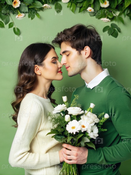 Молодая влюбленная пара позирует с цветами на зеленом фоне