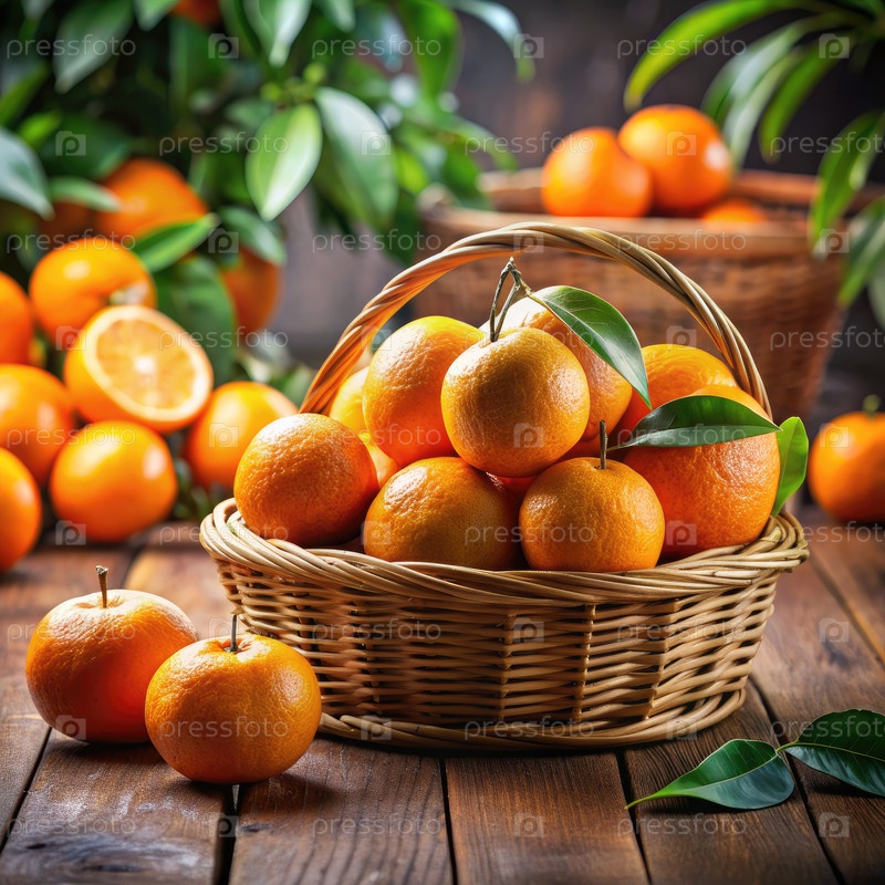 Свежие апельсины в корзине на деревянном столе