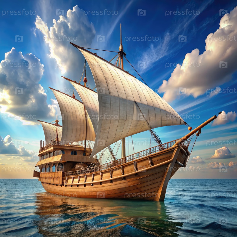 Каравель с парусами Dhow плывет через голубое небо и белые облака