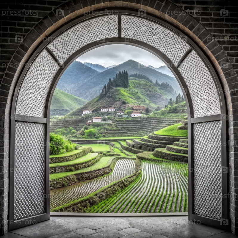 Аркированное окно с видом на пышные рисовые террасы и горы