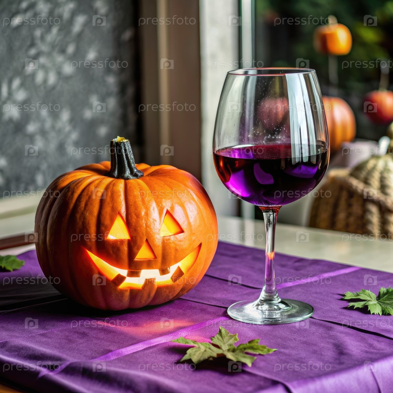 Тыква и бокал вина на фиолетовой скатерти для Хэллоуина