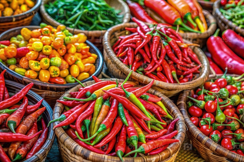 Свежие красные и желтые перец в тканых корзинах на рынке