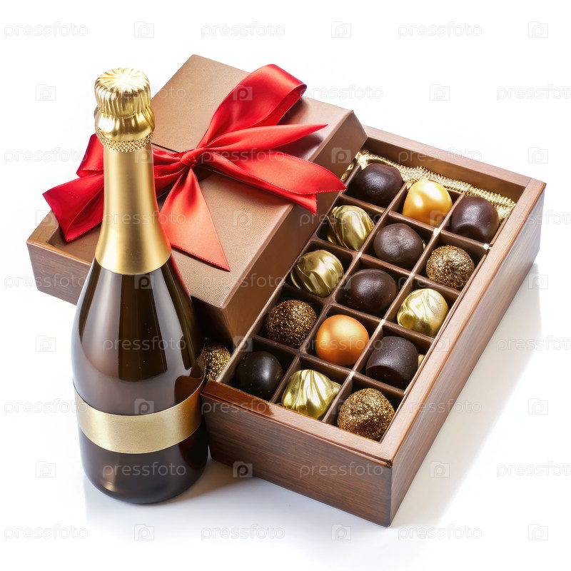 Шампанское и шоколадный подарочный ящик на белом фоне
