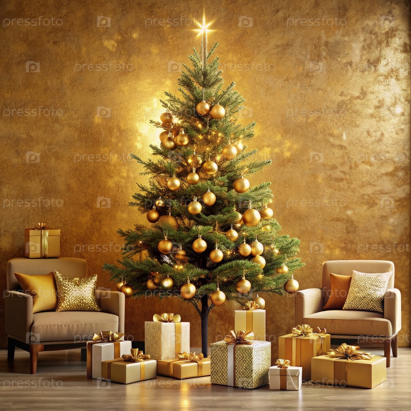 Рождественская елка, украшенная золотыми орнаментами в гостиной