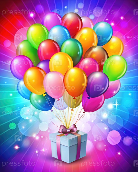Красочные воздушные шары плавают над коробкой для подарков на праздничном фоне