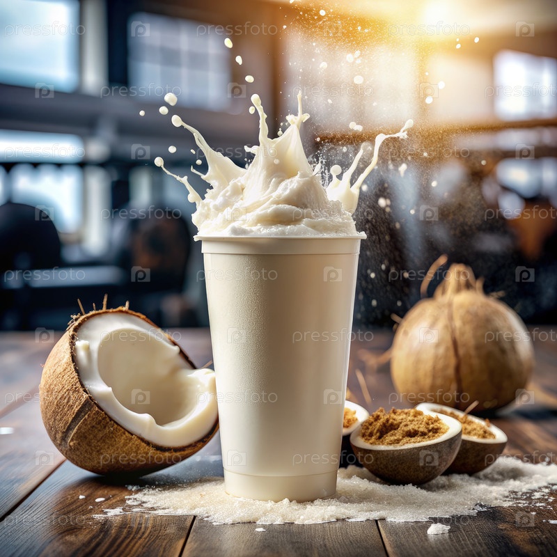 Кокосовое молоко брызгает в белую чашку с кокосовыми фруктами и хлопьями