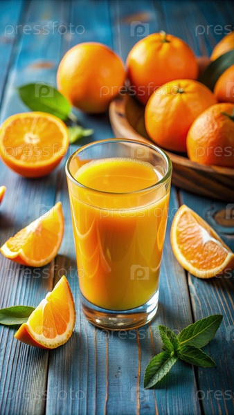 Свежевыжатый апельсиновый сок с апельсинами и мятой на голубом деревянном столе